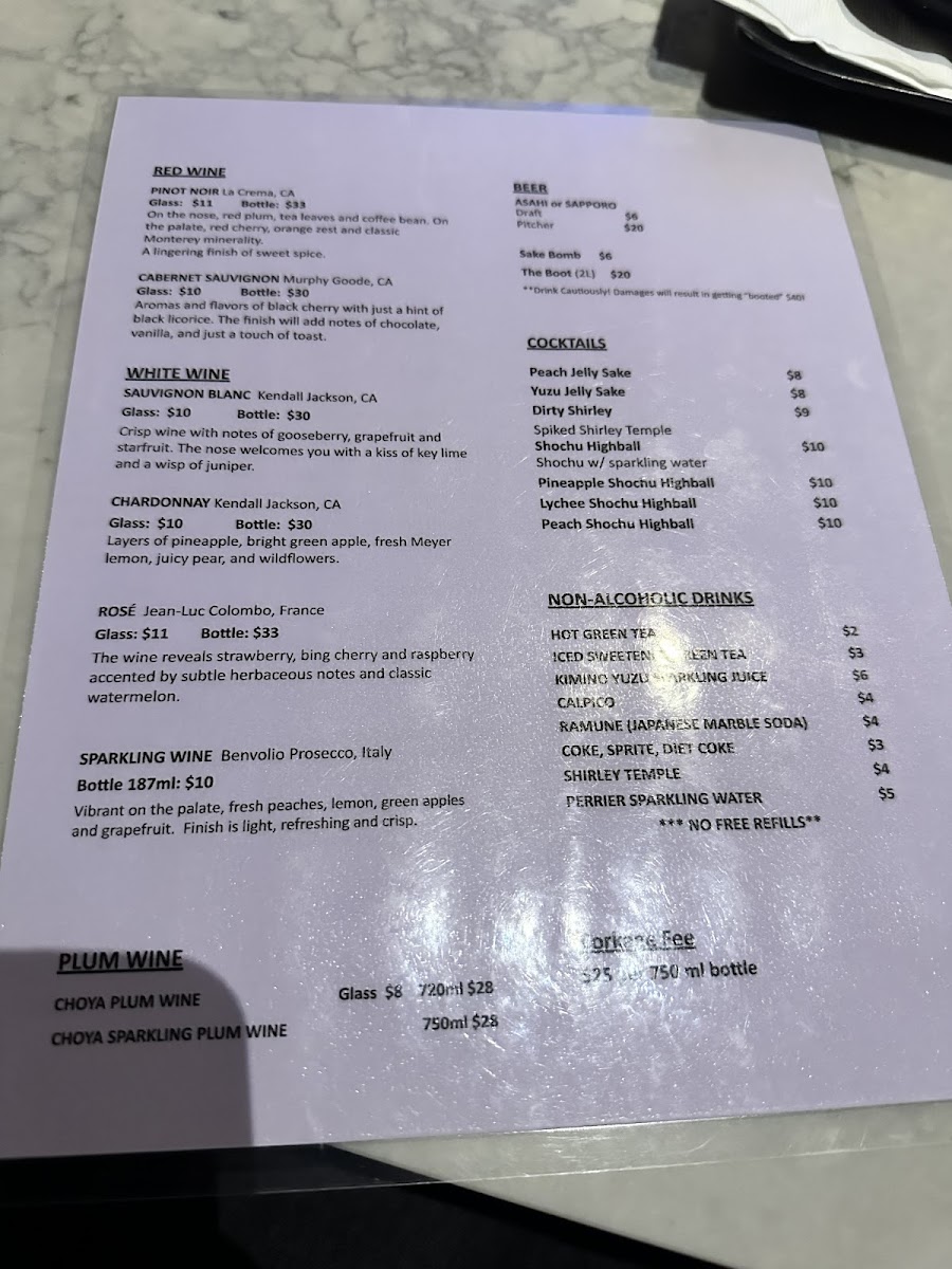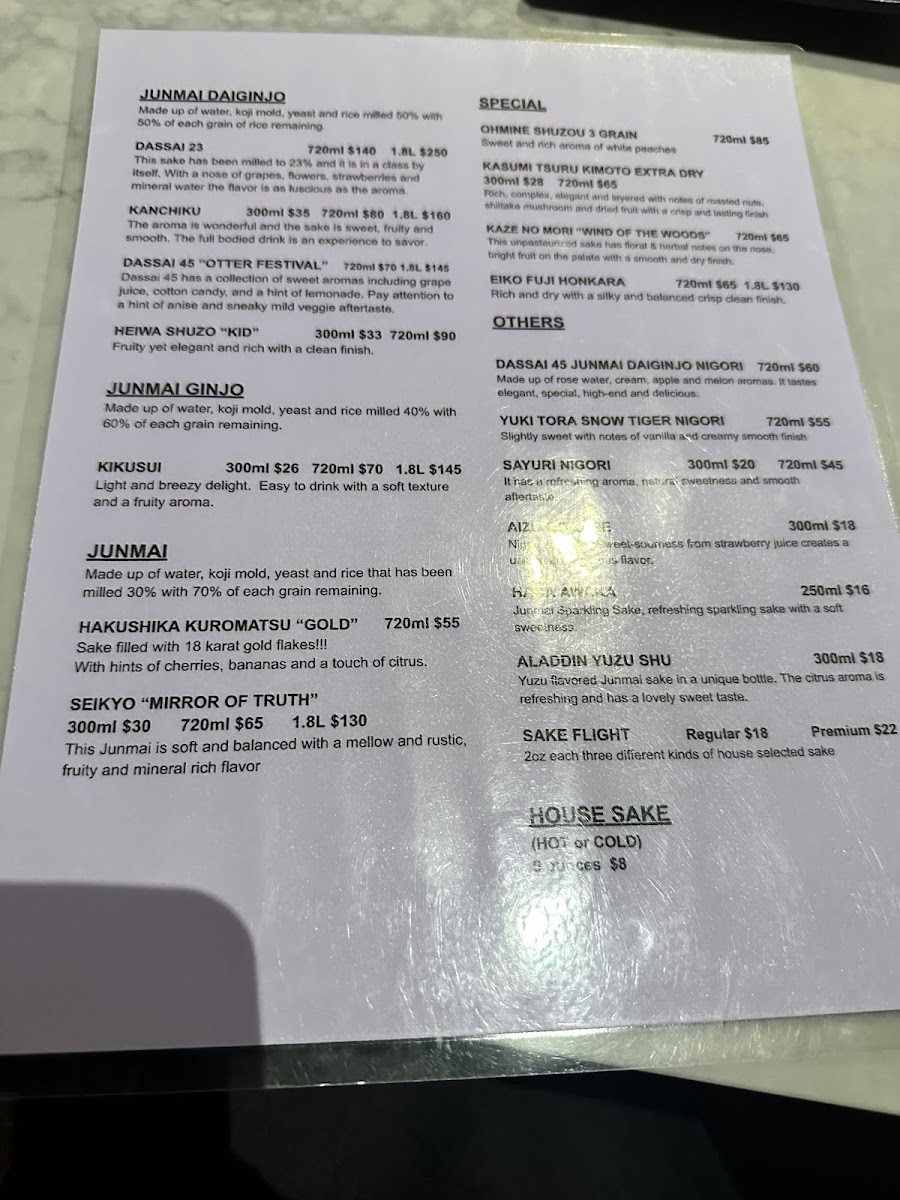 Accompany your meal with a tantalizing selection from the beer and sake menu. The House Cold Sake and the Aladdin Yuzu Sake are ideal choices to enhance your dining experience – refreshing and perfectly balanced. If you're in for a lighter sip, the Japanese marble soda Ramune is a fun and bubbly treat that can brighten any meal.